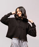 Tear-out label. Oversized hoody with cropped raw hem and functioning drawcord around hood. Set-in sleeves, with dropped shoulders. Single Jersey back neck tape.